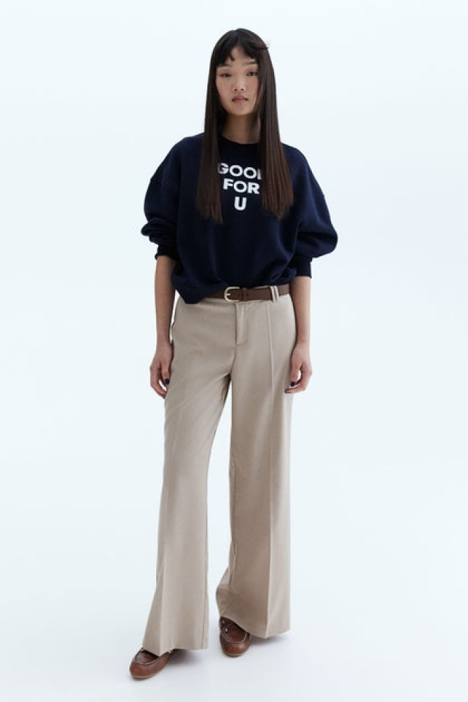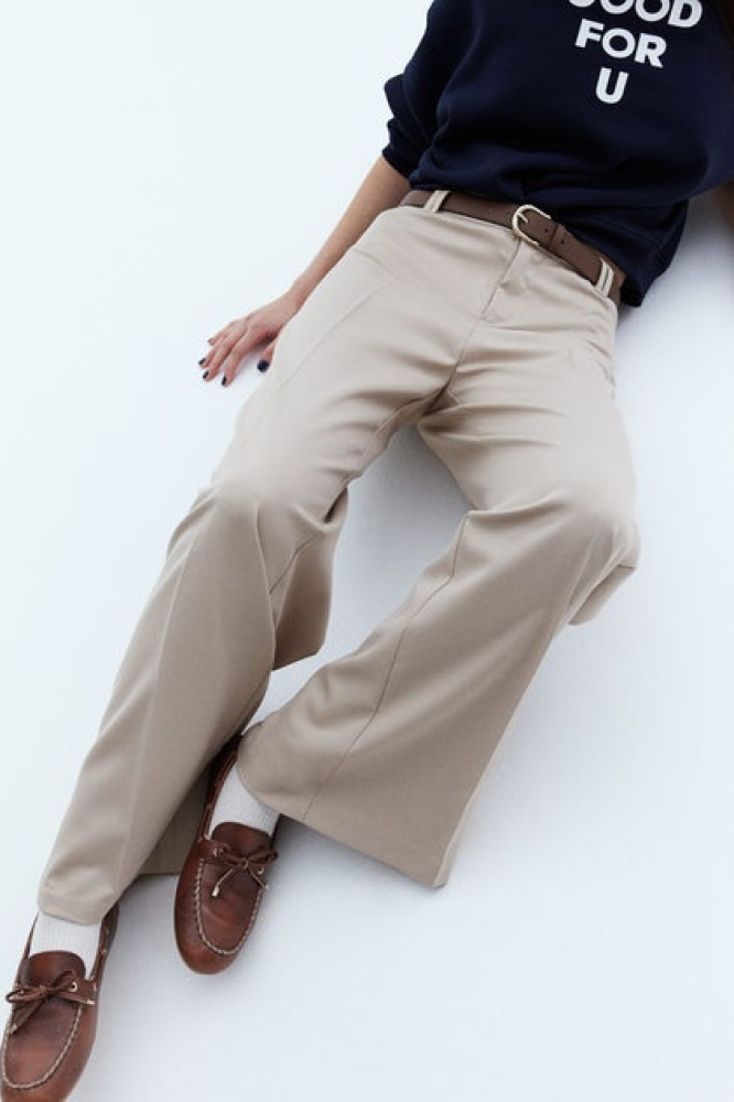 نُسج هذا البنطلون من التويل بقصّة خصر عادية مع فتحة سحّاب وإبزيم إغلاق مخفي، وجيوب وهمية من الخلف، وساقين واسعتين تتخللهما كسرات من الأمام تعزز من جمال مظهرهم.